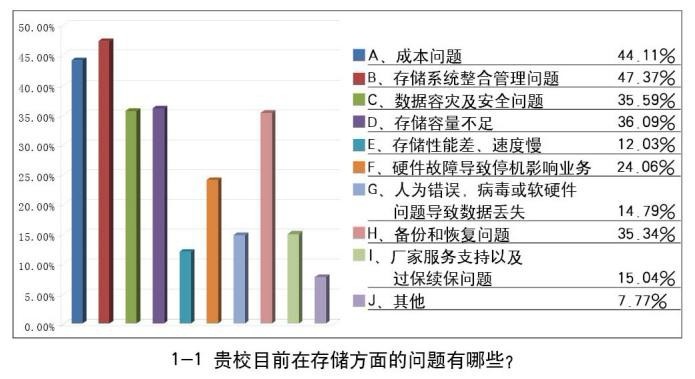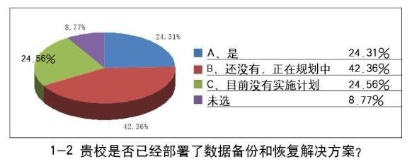 在提到学校存储方面存在的问题时,最大的因素集中在存储系统整合管理、成本、存储容量、数据容灾安全、数据备份等问题上,数据的安全和管理问题已经成为当前关注的热点。调查数据表明,有70%左右的学校对数据备份问题表示高度关注,有24.31%已经实现数据备份和恢复,有42.36%表示正在规划中;而仅有11.53%的学校表示未采用容灾方案。