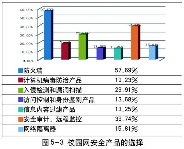 学校目前使用各类产品防范网络安全事件的发生,防火墙是普通高校保障内网安全的主要产品,有135 所学校选择了防火墙,占57.69%;安全审计、远程监控居其次,有93 所学校采用这一技术;选择入侵检测和漏洞扫描产品的有70 所学校(如图5-3)。