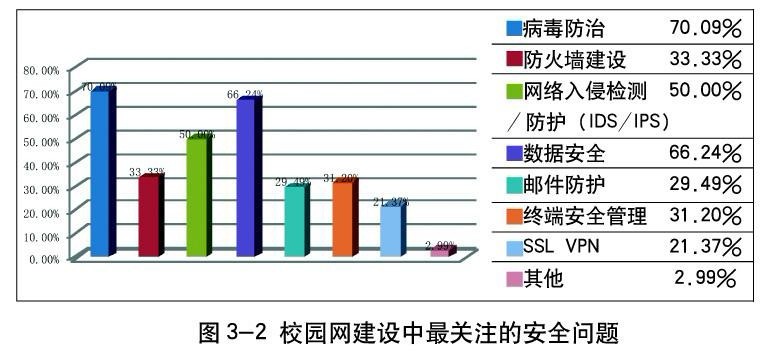 在校园网建设中,病毒防治、数据安全仍是高校网络建设关注的重中之重, 70.09% 的学校选择病毒防治,66.24%的学校选择数据安全,这与近一年来校园网安全事故频频发生,威胁到校园数据信息安全有很大关系(如图3-2)。