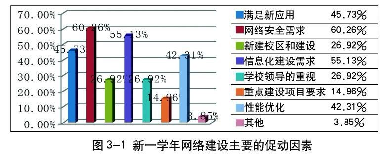 对于新一学年的网络建设,在主要的促动因素方面,网络安全需求、信息化建设和应用需求成为最重要的推动力量,调查中,141 个学校首选了网络安全需求,占60.26%(如图3-1)。可见,随着信息技术的推广和数字校园建设的展开,信息安全的需求也在激增。