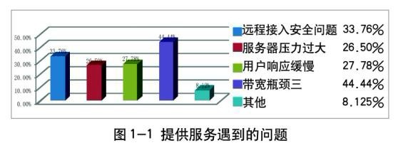 在问及提供服务时遇到的问题时,44.44%的学校选择了带宽瓶颈,33.76%的学校选择远程接入安全问题,26.50%的学校选择服务器压力过大(如图1-1)。可见,带宽瓶颈问题已经成为高校校园网提供服务的最大问题。