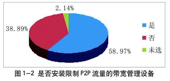 同时,随着数字化校园的纵深发展,计划对校园核心网络设备进行扩容的学校达到105 所,占44.87%,说明校园网升级的压力正在增长中,普通高校的网络需求仍然处于高速增长阶段。需求无限,资源有限,多数普通高校选择了对校园网流量进行有效管理,在调查中,58.97%的学校选择了对校园网流量进行控制,安装了限制P2P 流量的带宽管理设备(如图1-2)。