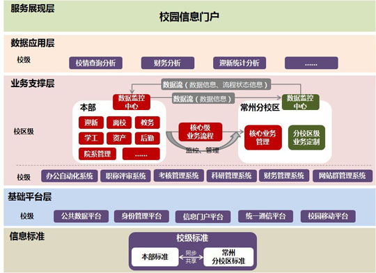 我校南京本部和常州校区的信息化建设将基于校级统一的信息标准共同构建,以本部的信息标准为核心,以常州分校区特性化的信息标准为建设子集,共同构建校级的信息标准,为我校本部和常州校区之间数据的交换、共享提供统一的遵循准则,保证信息化建设的一致性。