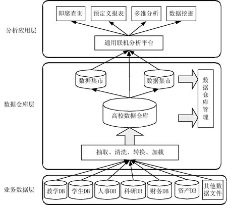 我校建立了一套高校校务决策支持系统的体系框架,该框架包括业务数据、数据仓库和分析应用三个层次。图1描述了校务决策支持系统的体系框架。