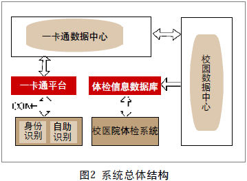 该系统由校园数据中心、一卡通数据中心、一卡通平台、体检信息数据库、校医院体检系统等组成。体检信息数据库通过数据接口与校园数据中心进行交互,获取体检人员的基本信息,直接存入体检信息数据库中,而不需要医务人员重新输入。一卡通平台采用COM+技术,通过对一卡通数据中心的调用,提供身份识别和自助付费的功能。系统结构如图2所示。