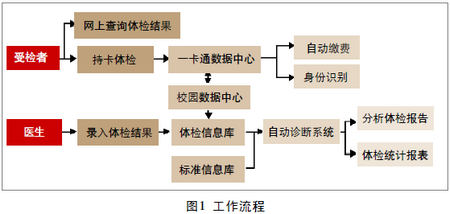 受检者按医院安排的日期按时来医院参加体检。首先通过一卡通平台进行身份验证和缴费。体检管理信息系统通过连接数据中心获取受检者的基本信息。体检时,根据不同的科室,不同的体检内容,负责人员可以将体检结果通过系统存入体检信息库里,也可以在体检之后集中录入。系统预先设定体检项目的常见结论,录入人员只需用鼠标进行选择即可。系统将以工作人员预先设定的体检项目参考值为依据,对各种体检指标进行关联分析,给出相关性分析结论以及建议报告。系统还根据校医院的具体需求给出统计分析结果,包括图表和图形分析。参加体检的人员通过登录校园统一门户查询自己的体检结果,这节省了双方的时间。工作流程如图1所示。