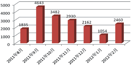 从2010年4月我们启用在线业务登记系统,到2011年7月底的一年多的时间内,平台上登记的业务只有884个。图1是2011年8月到2012年2月,网络中心业务平台上每个月登记的业务量。从图中可以看出,业务量在2011年8月开始,每个月的业务量都是原来的几十倍到几百倍。在业务扩大的情况下,只有恰当地增配服务人员,才能完成日常的工作,才能保证服务质量、服务效率和用户满意度。