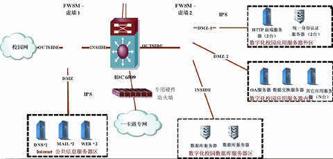 根据学校数字化校园的部署情况以及各服务器之间的调用关系,我们将数据中心划分为以下安全区域:Internet公共信息服务器区、数字化校园应用服务器外区、数字化校园应用服务器内区、数字化校园数据库服务器区。