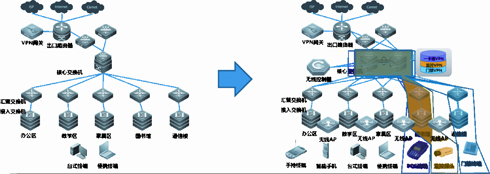 云校园网可以广泛承载学校的各个信息化业务系统。目前,国内很多高校除了一张给师生提供上网的校园网之外,还有很多张与校园网物理隔离的业务子网,一般包括:一卡通网、视频监控网和财务网等。但各种业务专网的建设致使校园网除了作为师生的上网通道之外,不承载学校的核心业务,所以在长期的发展过程中网络中心的地位逐渐被边缘化。而且,随着信息化建设“边际效益”的变小,使得网络建设项目的效益越来越不明显。导致这种边缘化趋势越来越显著。