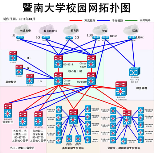 至2012年,校园网已构建完成万兆四核心、多汇聚、千兆到楼层、百兆到桌面的高速以太网架构,具有技术成熟、带宽高、速度快、经济实用的特点。现在全校已实现IPv4/IPv6双栈接入,拥有274个C类IPv4地址及6个48位IPv6地址,服务器数量超过150台。校园网采用多出口冗余设计,合计出口带宽为5.75G。