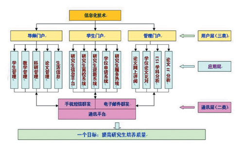 中国科大学位与研究生教育信息系统由导师、研究生、管理三大门户组成(系统总体框架见图1),覆盖了从迎新、学籍、培养,到导师、论文评阅、离校等多个环节。系统结构模块化,并且在传统的桌面系统基础上,进一步提供了对手机短信、电子邮件群发等通讯平台的支持。