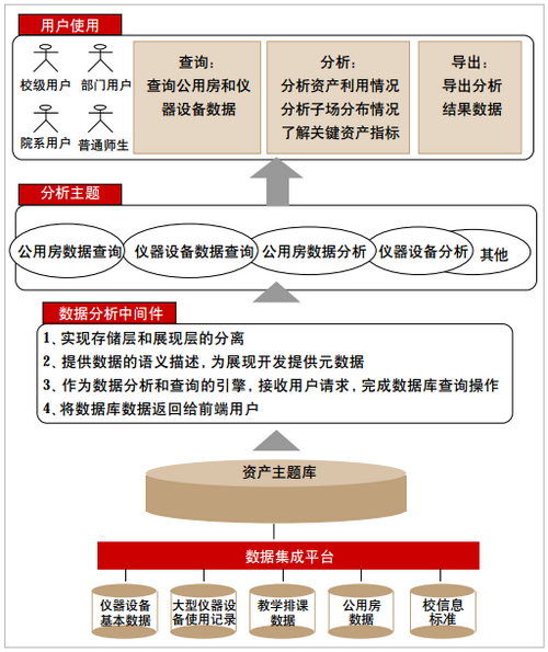 通过数据集成平台将仪器设备数据、大型仪器设备使用数据、房产建筑物数据、教学排课数据经过清洗转换,最终沉淀到公共资产主题数据库。通过引入资产相关的信息标准,使其与校信息标准结合,形成学校权威的资产信息标准体系。利用J2EE开发架构引用Oracle BIEE中间件技术,建立资产数据的分析应用主题,最终为学校领导、部门院系相关业务人员和普通师生提供有权限约束的数据服务。