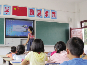 9月6日上午10时,记者走进贵池区梅村中心学校,正是上课时间,二年级一班的教室里,该校青年教师胡娟娟正在使用“班班通”给学生上课。记者看到,教室的黑板中间多了一块白板,面积约为黑板的一半。胡娟娟老师领着同学们朗诵课文《我们爱你啊,中国》,随着同学们一句句的朗诵,黑板中间的白板上相应的出现了与课文相关的桂林山水、杭州西湖、黄山和庐山的图片。