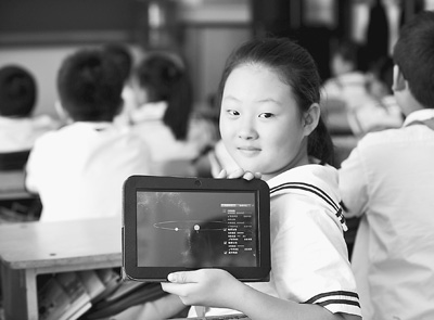 黑龙江省哈尔滨香滨小学学生在展示教学平板电脑。杨光摄