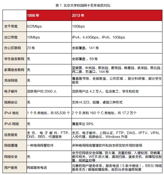 村地区教育与科研示范网络”,历经二十多年的建设历程,目前已成为国内高校规模最大的校园网络之一,具有规模庞大、结构复杂、用户活跃、使用率高等特点。截至2013 年4 月,校园网主干带宽达10Gbps,IPv4 出口带宽为4.43Gbps,IPv6 出口带宽为10Gbps,联网楼宇344 栋,联网信息点8.4 万个,联网计算机9 万余台,平均在线计算机2.5 万台,高峰时达3 万台。校园网覆盖校本部校区、昌平校区、圆明园校区和所有家属园区。校园网也已成为支撑北京大学教学、科研、管理和服务的重要信息基础设施。经过二十余年的建设,北京大学校园网规模不断扩大、信息服务体系不断完善、安全防护体系初见成效、多项网络视频技术逐渐服务教学科研、IPv6 建设稳步推进、CERNET/CNGICERNET2建设稳步发展。