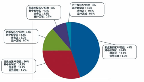 AP建设部分,多媒体教室、图书馆、会议室等高密度重点区域采用三条流450M双频AP;室外区域采用专业型室外大功率300M双频三模(802.11a/g/n) AP并搭配美化天线;其余区域采用两条流300M双频AP,其中宿舍区采用1台AP覆盖4个房间且天线入室的方案。全网共安装9500余台无线AP,其中450M高带宽AP及室外型AP各300余台,部分楼宇由于装修施工等原因无法安装AP,随着下一步此类楼宇AP安装施工完成,全校AP数量将上升至近万台,图2为五校区AP数量分布图,紫金港和玉泉两个校区的AP数量占总数的75%,五校区学生宿舍AP数量约占总数量的40%。