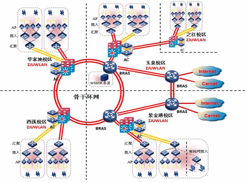 学校新一代校园无线网络项目于2012年8月全面启动,历时六个月大规模工程施工,建设完成了覆盖浙江大学五个校区近万台802.11n无线AP的高速校园无线网络,基本实现教学区、宿舍区及室外区域全覆盖。