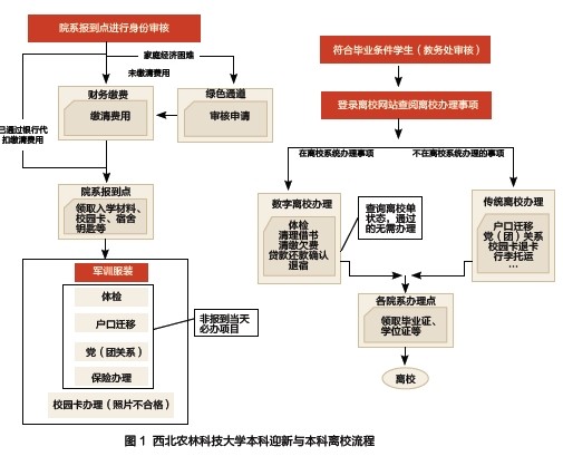 各部门的需求需要结合学校业务流程的优化来进行梳理、取舍,从为师生服务的角度来简化流程。如学校的数字迎新系统与数字离校系统,从方便学生的进校离校出发,对以前的流程做了优化,如图1所示。