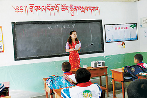 2014年6月,甘肃省民族地区1032所学校的5000个班级各新添了一套教学设备,在他们的英语、语文、藏语课上,这套语音设备用标准的发音带着孩子们一起读单词,读课文。
